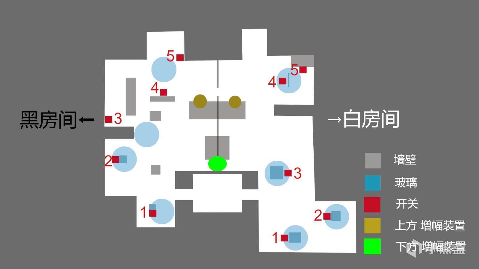 3.黑房间3号开关从上往下看的角度很刁钻,需要扫描员蹲在该玻璃旁靠近BOSS一侧才能看到
