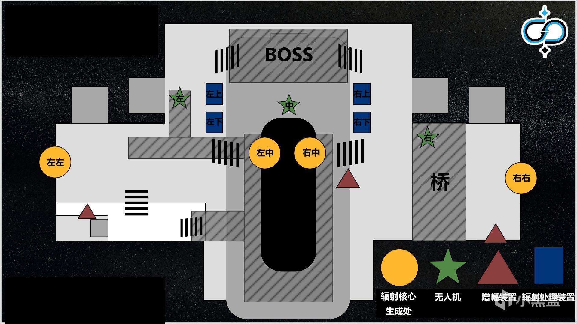 关卡开始前: 摸清楚整个地图,记住所有机制物品的位置,推荐以面向BOSS为原点,将从左往右4台辐射生成装置称为:左左,左中,右中,右右。4台辐射处理装置靠近BOSS的两台称为左前和右前,远离BOSS的两台称为左后和右后。