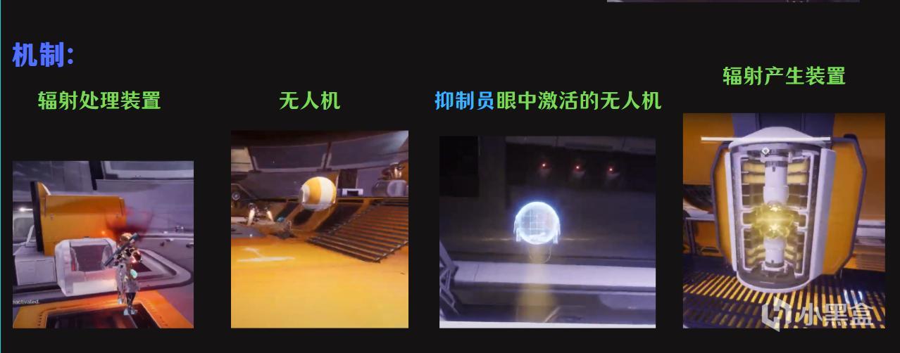 辐射生成装置:该装置会生成辐射核心,生成时会发黄光,所有人都能看的到,一次会有三台辐射生成装置共计生成三个辐射核心,需要操作员攻击开关关闭其中一个装置,仅生成两个辐射核心。